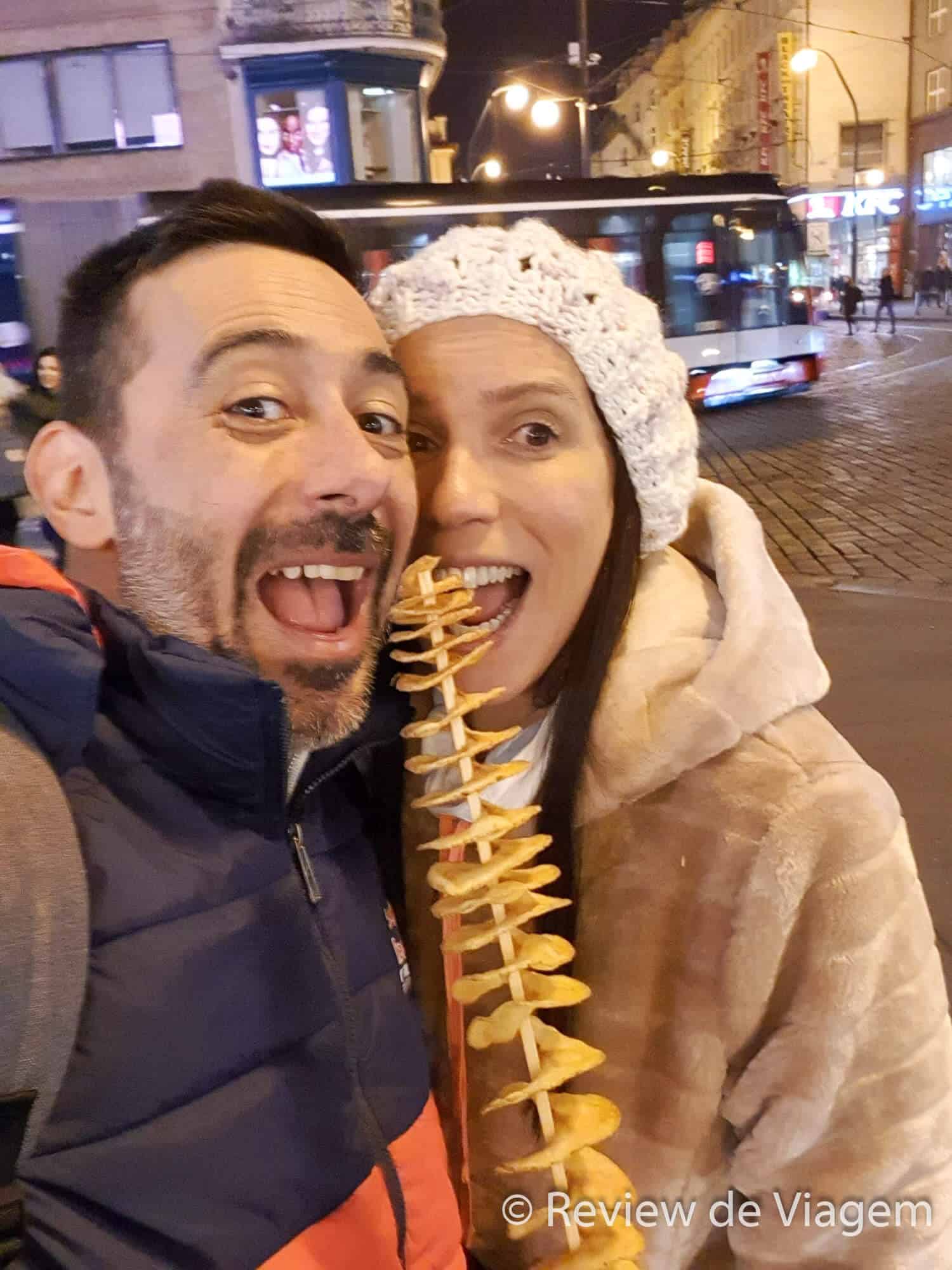 Passeando nas feirinhas de Praga também é possível comer. Existem opções de sanduíches com carne, salgados e doces em geral. Achamos a batata frita em parafuso bem diferente e compramos uma para experimentar (é gostosa!! )