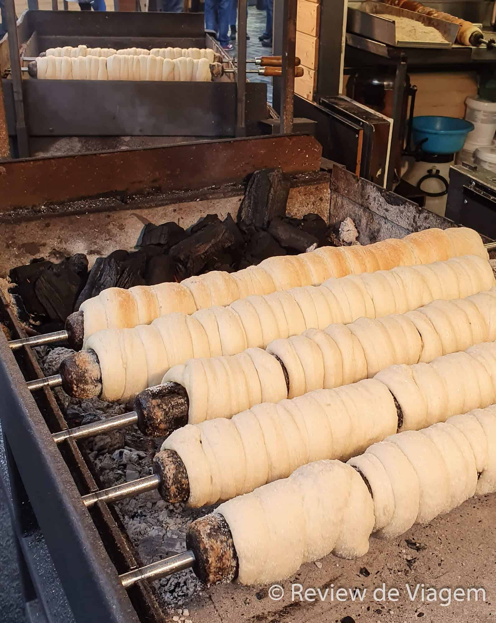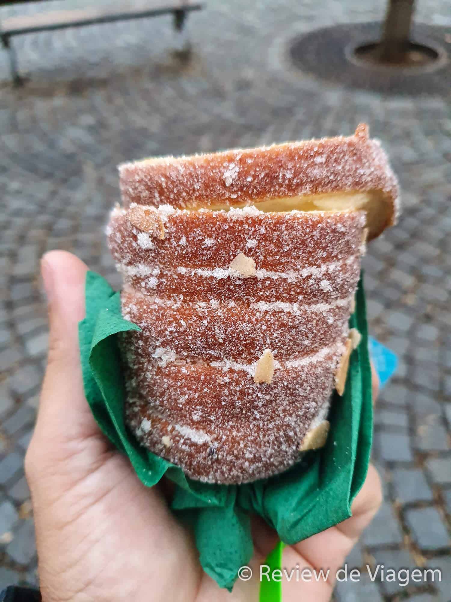 Agora as Dicas de Praga vão para a parte de “doces”Tem um doce em Praga que chama Trdelnik que é uma delícia! É uma massa com lascas de avelã assada na brasa em um espeto giratório. Normalmente se come com açúcar mas existem opções com Nutella, cremes, etc. Experimentamos o tradicional e com Nutella. Apesar do Guto ser fã de Nutella a versão “original” ganhou na nossa preferência.