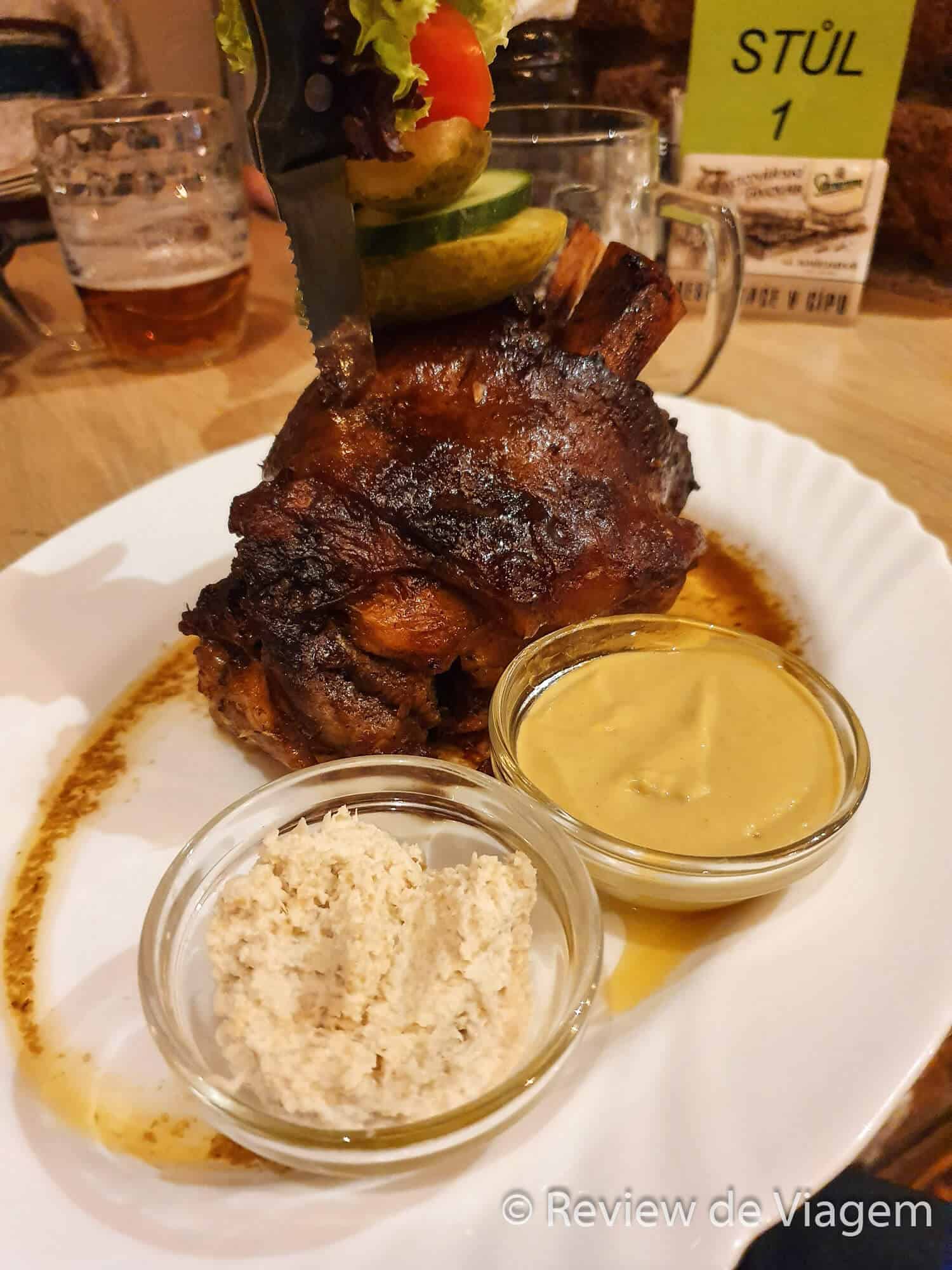 Um outro restaurante chamado V Cípu que era praticamente no porão e que parecia ser bonito e interessante chamou nossa atenção. Fomos até lá e havia uma mesa vaga. Sentamos, pedimos uma Pilsen local e começamos a olhar o cardápio. Depois de um tempo de indecisão optamos por dois pratos: um joelho de porco para o Guto e um pato com molho de laranja para a Maclau. A gente pediu, ficou conversando e fazendo os planos do dia seguinte já que era nosso primeiro dia de viagem! O Guto levantou para ir no banheiro e nesse meio tempo os pratos chegaram.